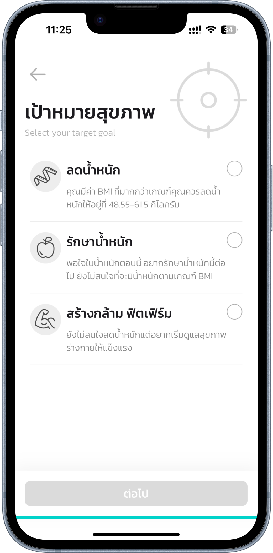 สร้างบัญชี และข้อมูลสุขภาพ สร้างบัญชี และข้อมูลสุขภาพ เพียงสมัครสมาชิกและกรอกข้อมูลพื้นฐาน เช่น น้ำหนัก ส่วนสูง และพฤติกรรมสุขภาพ คุณก็เริ่มต้นใช้งานแอปสานสุขได้ทันที เพื่อการแนะนำที่แม่นยำยิ่งขึ้น เพียงสมัครสมาชิกและกรอกข้อมูลพื้นฐาน เช่น น้ำหนัก ส่วนสูง และพฤติกรรมสุขภาพ คุณก็เริ่มต้นใช้งานแอปสานสุขได้ทันที เพื่อการแนะนำที่แม่นยำยิ่งขึ้น ข้อมูลส่วนตัว ข้อมูลสัดส่วน ข้อมูลความแอคทีฟ ข้อมูลโรคประจำตัว เป้าหมายสุขภาพ สรุปการสร้างโปร์ไฟล์ เป้าหมายสุขภาพ เป้าหมายสุขภาพเป็นอีกส่วนสำคัญของการสร้างเเรงจูงใจให้คุณในการดูแลสุขภาพตัวเอง คุณสามารถเลือกเป้าหมายตามที่ต้องการได้ที่นี่เลือกเป้าหมายสุขภาพของคุณโดยเลือกตามความเหมาะสม บทเรียนต่อไป เชื่อมต่อนาฬิกา เชื่อมต่อกับแอปหรืออุปกรณ์สุขภาพ เพื่อให้ข้อมูลสุขภาพของคุณไหลเข้าแอปสานสุขแบบอัตโนมัติ ช่วยให้แนะนำได้แม่นยำยิ่งขึ้น อ่านต่อ