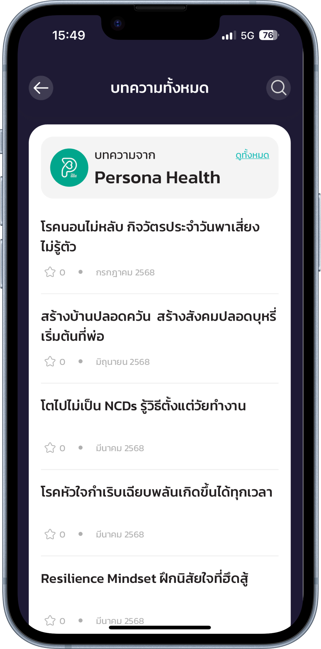 วงกลมองค์รวมสุขภาพ วงกลมองค์รวมสุขภาพ มองเห็นสุขภาพของตัวเองในมุมใหม่ด้วยวงกลมสุขภาพที่สะท้อนพฤติกรรมแต่ละวันอย่างอ่อนโยน มองเห็นสุขภาพของตัวเองในมุมใหม่ด้วยวงกลมสุขภาพที่สะท้อนพฤติกรรมแต่ละวันอย่างอ่อนโยน การดูวงกลมองค์รวมสุขภาพ ข้อมูลภาพรวมสุขภาพ บทความแนะนำ บทความจาก Persona Health บทความจาก Persona Health บทความเหล่านี้ได้รับการคัดสรรมาจาก Persona Health ฐานข้อมูลสุขภาพที่พัฒนาร่วมกับ สำนักงานกองทุนสนับสนุนการสร้างเสริมสุขภาพ (สสส.) ซึ่งออกแบบให้เหมาะสมกับบริบทของคนไทยอย่างแท้จริงเนื้อหาจะถูกปรับให้สอดคล้องกับพฤติกรรมของคุณที่อยู่ในระบบเพื่อให้คำแนะนำที่คุณได้รับ ตรงใจใช้ได้จริง และเหมาะกับคุณมากที่สุด บทเรียนต่อไป Day Streak มองเห็นความสม่ำเสมอของตัวเองในแต่ละวัน ผ่านการสะสมวันดูแลสุขภาพ ที่จะค่อย ๆ สร้างวินัย และความเปลี่ยนแปลงอย่างมั่นคง อ่านต่อ
