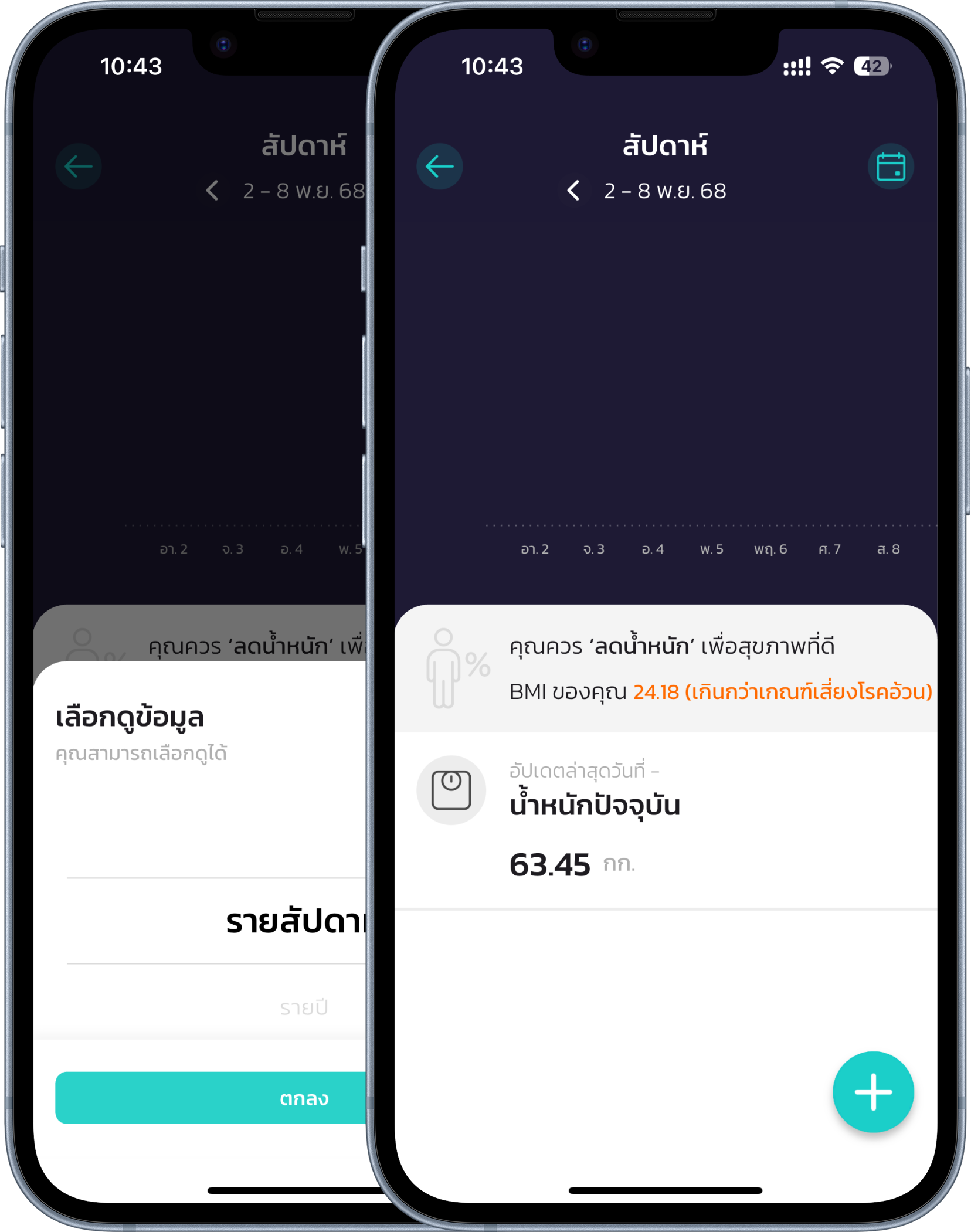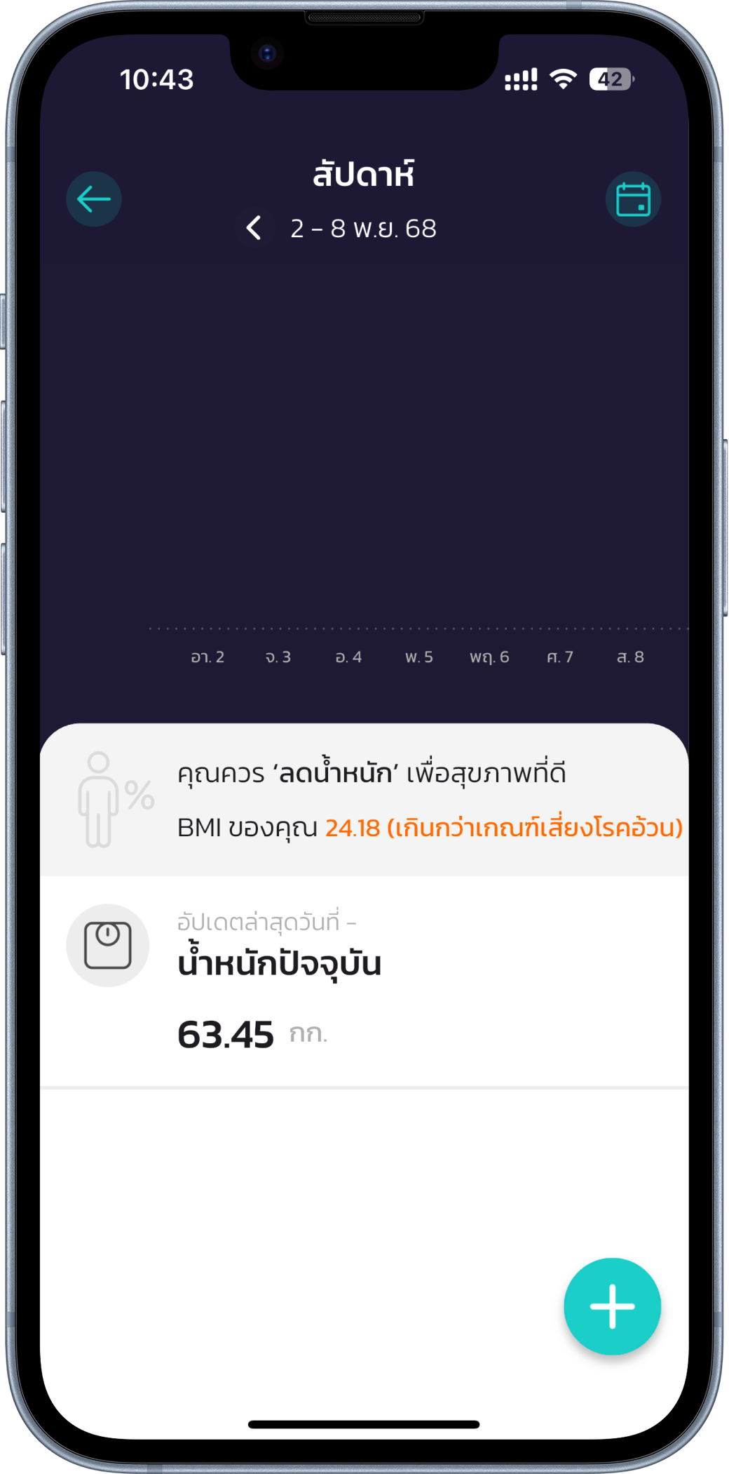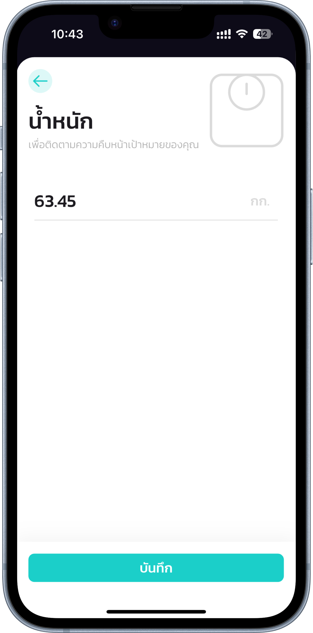 บันทึกน้ำหนัก และรอบเอว บันทึกน้ำหนัก และรอบเอว ติดตามรูปร่างของคุณได้แบบครบมุม ทั้งน้ำหนักและรอบเอว คุณสามารถดูกราฟย้อนหลัง เลือกรูปร่างใกล้เคียง และเข้าใจการเปลี่ยนแปลงของตัวเองได้ชัดเจนขึ้นทุกวัน ติดตามรูปร่างของคุณได้แบบครบมุม ทั้งน้ำหนักและรอบเอว คุณสามารถดูกราฟย้อนหลัง เลือกรูปร่างใกล้เคียง และเข้าใจการเปลี่ยนแปลงของตัวเองได้ชัดเจนขึ้นทุกวัน บันทึกน้ำหนัก บันทึกรอบเอว บันทึกน้ำหนัก คุณสามารถติดตามน้ำหนักของตัวเองได้หากอยู่ในช่วงที่ลดน้ำหนัก หรือเพิ่มน้ำหนัก โดยสานสุขจะมีข้อความแจ้งเตือนหาก BMI ของคุณสูง หรือต่ำเกินไป เพื่อลดความเสี่ยงต่อโรค 1. ไปยังเมนู ‘หัวใจสานสุข’ เพื่อทำการเปิดหน้าบันทึก 2. เลือกเมนู ‘น้ำหนัก’ แล้วสานสุขจะนำคุณมายังหน้าน้ำหนัก 3. กด ‘+’ ที่มุมล่างขวาเพื่อบันทึกน้ำหนักล่าสุดของคุณ 4. คุณสามารถกดที่ ‘ปฏิทิน’ ที่มุมบนขวาเพื่อทำการเลือกดูน้ำหนักย้อนหลังได้ บันทึกน้ำหนัก บันทึกรอบเอว บันทึกน้ำหนัก คุณสามารถติดตามน้ำหนักของตัวเองได้หากอยู่ในช่วงที่ลดน้ำหนัก หรือเพิ่มน้ำหนัก โดยสานสุขจะมีข้อความแจ้งเตือนหาก BMI ของคุณสูง หรือต่ำเกินไป เพื่อลดความเสี่ยงต่อโรค 1. ไปยังเมนู ‘หัวใจสานสุข’ เพื่อทำการเปิดหน้าบันทึก 2. เลือกเมนู ‘น้ำหนัก’ แล้วสานสุขจะนำคุณมายังหน้าน้ำหนัก 3. กด ‘+’ ที่มุมล่างขวาเพื่อบันทึกน้ำหนักล่าสุดของคุณ 4. คุณสามารถกดที่ ‘ปฏิทิน’ ที่มุมบนขวาเพื่อทำการเลือกดูน้ำหนักย้อนหลังได้ บทเรียนต่อไป บันทึกพฤติกรรม ติดตามพฤติกรรมในชีวิตประจำวันได้อย่างละเอียด ทั้งการดื่มน้ำ ดื่มแอลกอฮอล์ และการสูบบุหรี่ ช่วยให้คุณเห็นภาพรวมสุขภาพ และวางแผนปรับพฤติกรรมได้ดีขึ้นทุกวัน อ่านต่อ