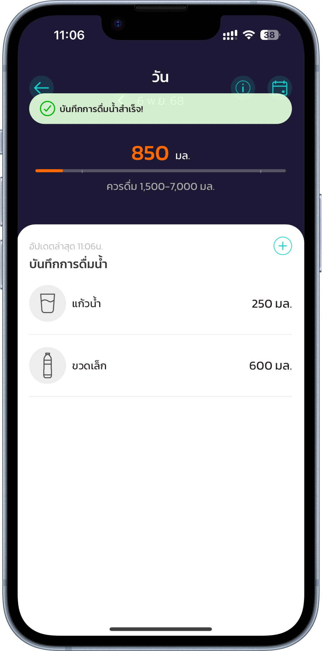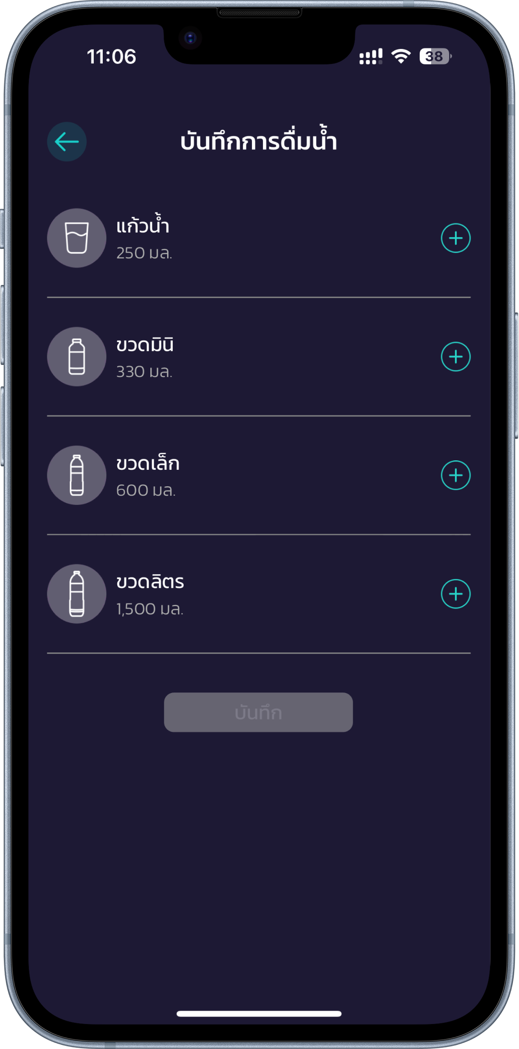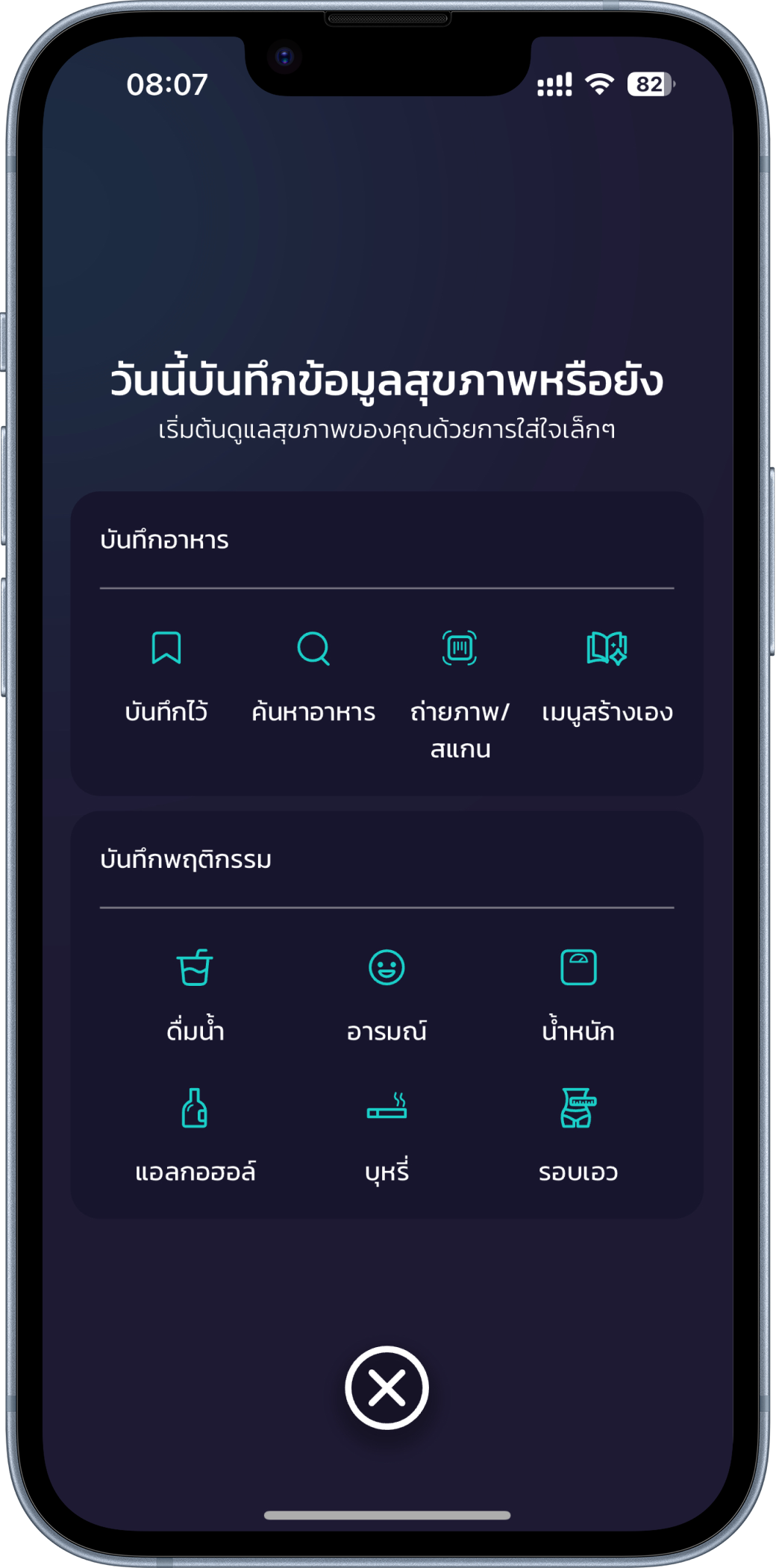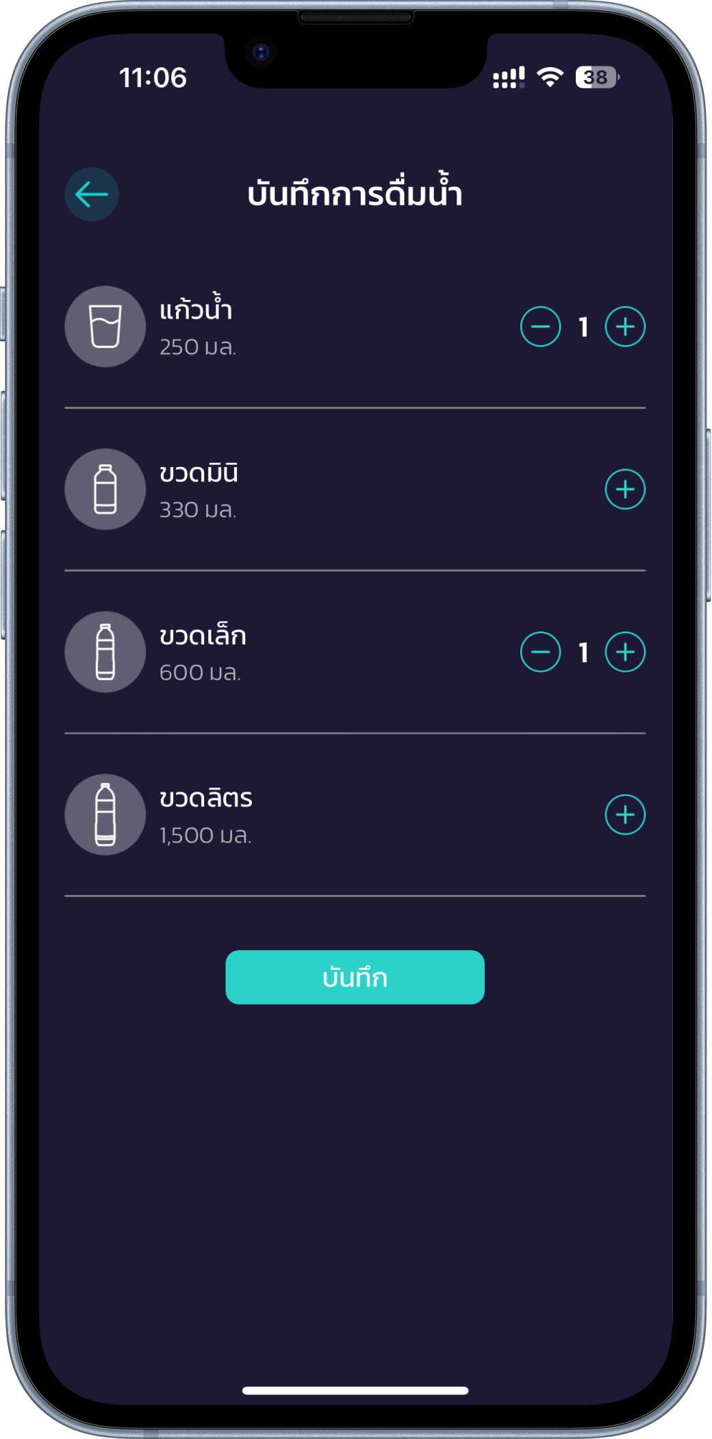 บันทึกพฤติกรรม บันทึกพฤติกรรม ติดตามพฤติกรรมในชีวิตประจำวันได้อย่างละเอียด ทั้งการดื่มน้ำ ดื่มแอลกอฮอล์ และการสูบบุหรี่ ช่วยให้คุณเห็นภาพรวมสุขภาพ และวางแผนปรับพฤติกรรมได้ดีขึ้นทุกวัน ติดตามพฤติกรรมในชีวิตประจำวันได้อย่างละเอียด ทั้งการดื่มน้ำ ดื่มแอลกอฮอล์ และการสูบบุหรี่ ช่วยให้คุณเห็นภาพรวมสุขภาพ และวางแผนปรับพฤติกรรมได้ดีขึ้นทุกวัน บันทึกการดื่มน้ำ บันทึกการดื่มแอลกอฮอล์ บันทึกการสูบบุหรี่ บันทึกการดื่มน้ำ ไม่ใช่แค่การกิน การดื่มน้ำก็เป็นอีกเรื่องสำคัญสำหรับการดูแลสุขภาพอย่างสมดุล คุณสามารถบันทึกพฤติกรรมการบันทึกการดื่มน้ำได้ผ่านสานสุข 1. ไปยังเมนู ‘หัวใจสานสุข’ เพื่อทำการเปิดหน้าบันทึก 2. เลือกเมนู ‘ดื่มน้ำ’ เพื่อทำการบันทึก 3. กด ‘+’ เพื่อทำการบันทึกการดื่มน้ำตามปริมาณที่ต้องการ 4. หลังจากบันทึกสำเร็จคุณจะเห็นข้อมูลการดื่มน้ำในหน้าแดชบอร์ดการดื่มน้ำ บันทึกการดื่มน้ำ บันทึกการดื่มแอลกอฮอล์ บันทึกการสูบบุหรี่ บันทึกการดื่มน้ำ ไม่ใช่แค่การกิน การดื่มน้ำก็เป็นอีกเรื่องสำคัญสำหรับการดูแลสุขภาพอย่างสมดุล คุณสามารถบันทึกพฤติกรรมการบันทึกการดื่มน้ำได้ผ่านสานสุข 1. ไปยังเมนู ‘หัวใจสานสุข’ เพื่อทำการเปิดหน้าบันทึก 2. เลือกเมนู ‘ดื่มน้ำ’ เพื่อทำการบันทึก 3. กด ‘+’ เพื่อทำการบันทึกการดื่มน้ำตามปริมาณที่ต้องการ 4. หลังจากบันทึกสำเร็จคุณจะเห็นข้อมูลการดื่มน้ำในหน้าแดชบอร์ดการดื่มน้ำ บทเรียนต่อไป ชาเลนจ์แนะนำสำหรับคุณ สานสุขจะแนะนำชาเลนจ์ที่เหมาะกับเป้าหมายของคุณให้สุขภาพดีขึ้น สนุกขึ้น และทำได้ต่อเนื่อง อ่านต่อ